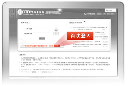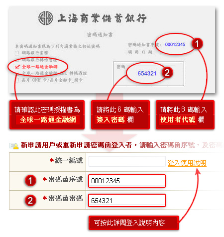 請使用您於分行領取的「全球一路通金融網」密碼通知書,並在登入頁面輸入以下資料: