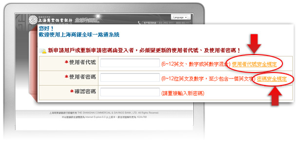 登入成功後,系統會引導您進一步設定 『系統管理者』的【使用者代號】及新密碼,設定規則請點選 “使用者代號安全規定”及”密碼安全規定”之說明: